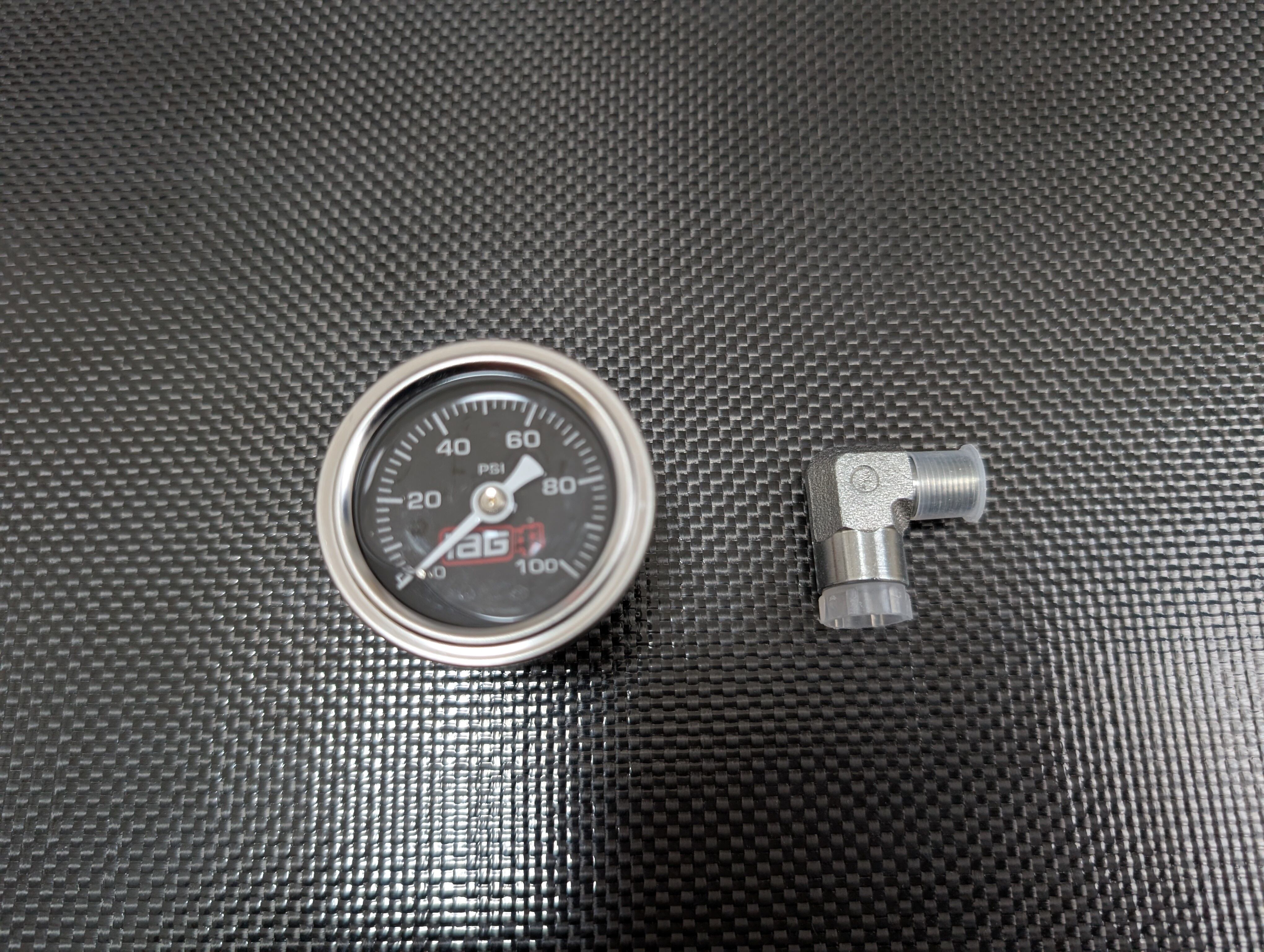 0-100 PSI オイル封入燃圧ゲージ、フィッティング エルボ 90度, 1/8" NPTF オス x 1/8" NPTF メス付き